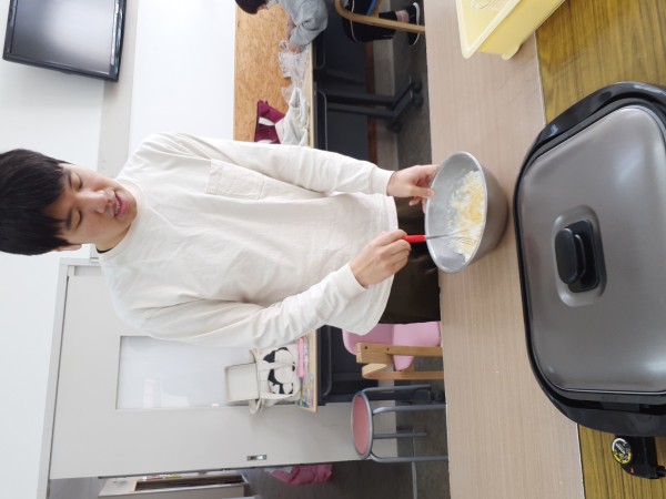 待ちに待った 『クッキング』お菓子作りの日です。 玉子を割り。小麦粉、ベーキングパウダー。水合わせこねます。皆で協力。 ホットケーキできあがり。 あんずジャムで、彩りよくなりました。